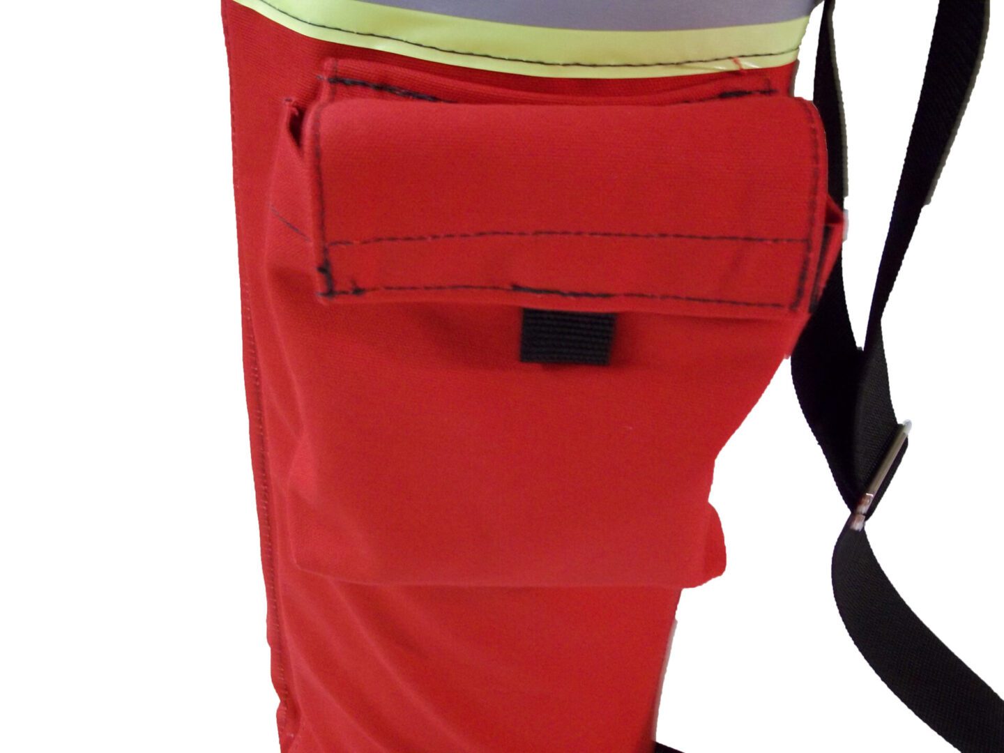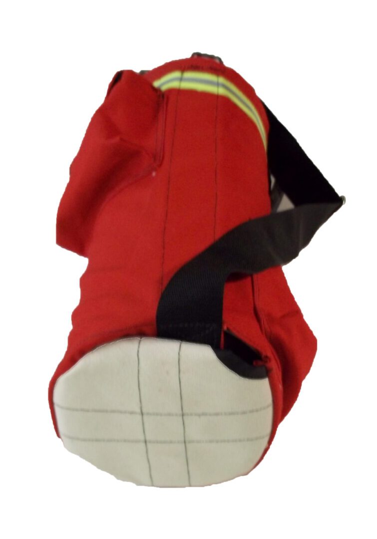 This bag fits any size water can style extinguisher. Also makes a great Air Chisel Bag. Size is 7 3/8” round by 20” high. Made of 1000D Cordura. Bag has two outside pockets and an adjustable web strap with 1” metal D-ring tie-down for nozzle ends. Strap is constructed of 2” heavy-duty web, with 2” heavy-duty nickel snap hook and 2” tri-glide hardware to adjust easily. It has a drawstring top with barrel lock, to close snugly around any size bag. Comes standard in red.