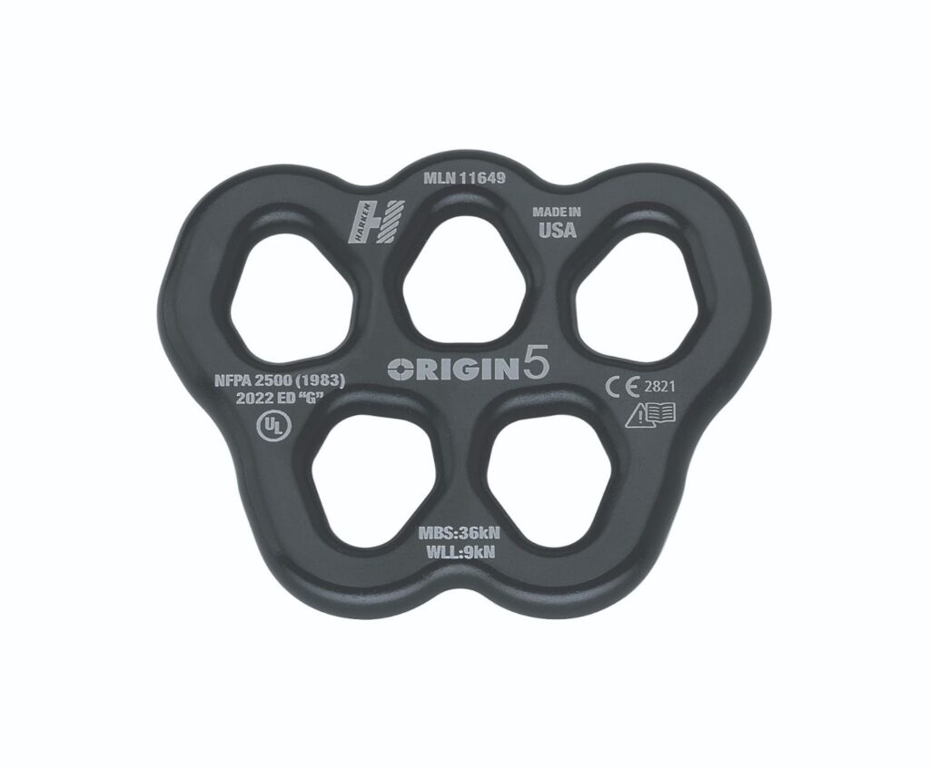 Strong and lightweight, with an MBS of 36 kN in any direction, the Origin 5 is manufactured with custom tooling to create textile-friendly rounded edges. The large connection holes allow you to easily rotate most locking carabiners. Ideal for keeping rigging organized and for use as a master point for litter bridals