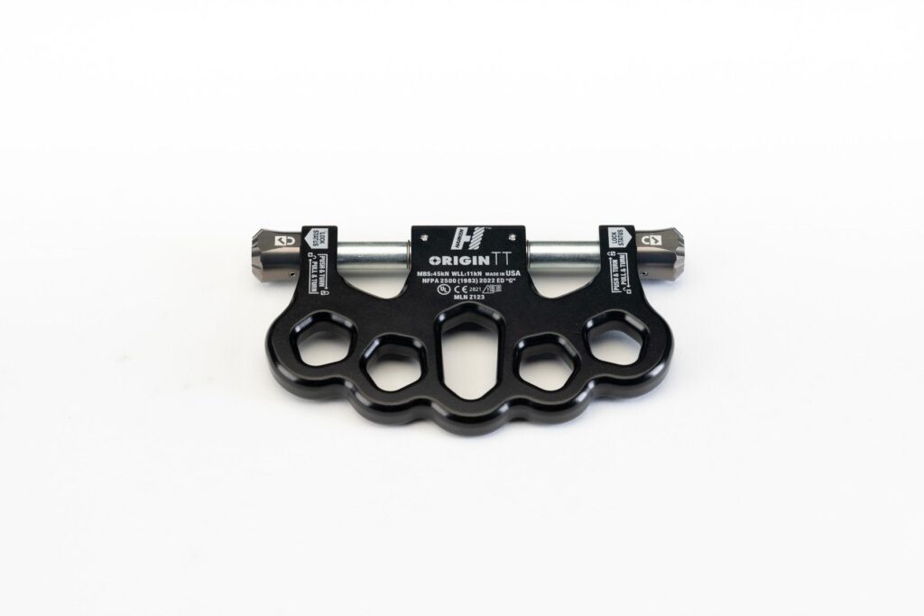 On the raise/lower side, Origin TT provides a seamless link with the CLUTCH and similar multi-purpose devices from other manufactures, eliminating the need for carabiners and shortening overall system length. There are five attachment points on the anchor side which enable rigging of ‘SERENE’ systems (Systems Strong, Equalized, Redundant, Efficient with No Extension potential). Eliminating carabiners also removes play in the system that can diminish coordination between the two lowering devices which remain immediately adjacent and aligned. This facilitates the coordinated precision that results from the dual-handled operation (Sharkfinning) where Origin TT excels.