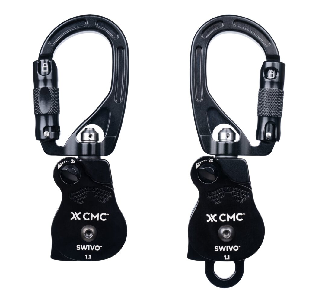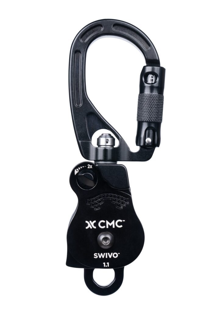 Ergonomic and efficient, SWIVO can be operated one-handed using the double-detent button, pivoting sideplate, and auto-locking gate. It excels in M/A systems and works well with high anchors, tripods, and redirects. Teaming up with Rock Exotica, CMC is offering SWIVO in a single sheave model (NFPA/CE) and a double sheave model (NFPA). The oval carabiner frame is designed for high strength and meets NFPA Technical Use. SWIVO is patented, made in the USA, and brought to you by two companies committed to quality and service.