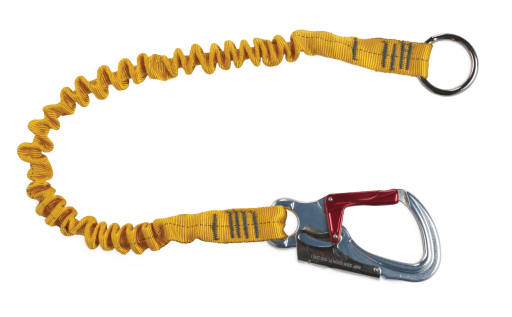 This strong tether, made from 1-inch tubular web with a built-in bungee, works as a “live bait” water rescue attachment to your PFD.