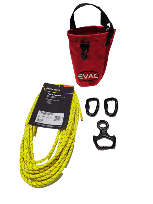 Mini rope bag used to carry and store a personal escape or self rescue kit. Model B uses a small rope bag that attaches to your web gear or belt using a metal clip and also has a carrying handle. Holds 50′ of rope along with personal rescue hardware. Also available as a kit that includes rope and hardware. Size – 5″W x 9″H