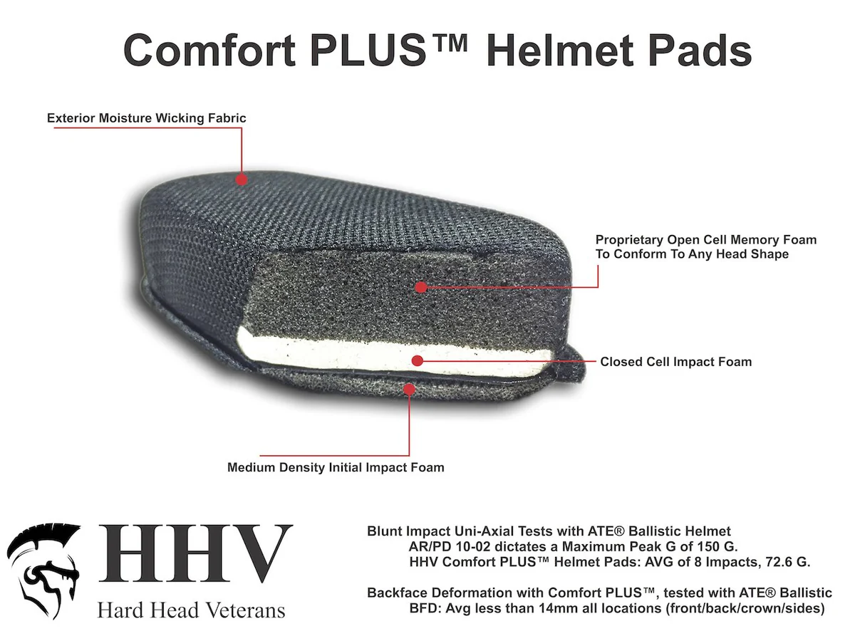 Here’s the deal: Anyone who has issued military helmet pads knows the fatigue, hot spots, and overall discomfort caused by poorly designed combat helmet pads. Now HHV’s Comfort PLUS Ballistic Helmet Pads not only bring a new level of comfortability but protection as well. We utilize a 2 layer system inside our pads. The first layer designed for added blunt and impact resistance. While the second comfort layer is comprised of a proprietary memory foam layer that provides all-day comfort. The pads are then covered in moisture wicking fabric. Want to know the best part? HHV helmet pads fit FAST, MICH, and ACH or ECH helmets.