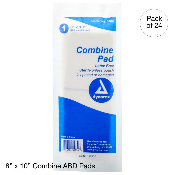 Combine ABD Pads are an essential first aid item to help stop massive bleeding and to help serious larger wounds. They are a choice pad for surgeons and any emergency medical professional to contain bleeding. These are sterile and ready to use. The 8×10 inch pad comes in a master case of 360 pieces and can be broken down into inner packs of 24 pieces.