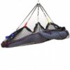 Net for suspension and transport of corpse and light loads by helicopter, with the possibility of hooking and retrieving by means of a winch or with the use of a barycentric hook. The device is compressible to a small size for storage on board the helicopter and is easy to use, also thanks to the color-coded connection straps. The load to be transported can be easily centered even when used on uneven ground, using the special reference positioned on the net.