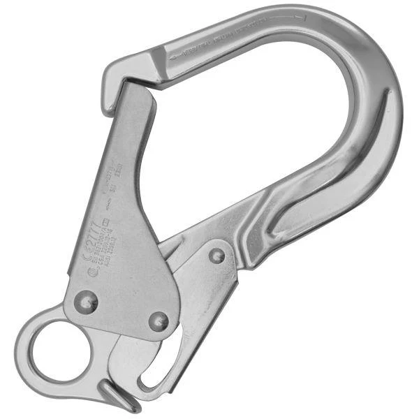 This aluminum connector is certified according to EN 362/A, ANSI Z359.12, and CSA Z259.12-16 standards, ensuring high strength and performance, especially under mechanical stress on the gate. Ideal for connecting to scaffolding, platforms, towers, and cranes, it features a double-action locking mechanism and a large opening up to 62 mm