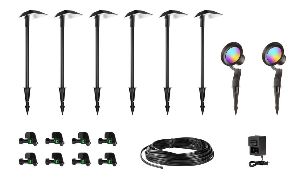 Introducing the NEBO Low Voltage 120 W LED Pathway Light and Spot Light Kit 8 pack, the perfect addition to any backyard. This kit includes 6 sleek path lights and 2 color-changing spotlights, 8 connector clips, 8 ground stakes, a 120W transformer with a dawn to dusk sensor, and 75 feet of wire for easy installation. The powder-coated dark brown espresso finish perfectly accents any outdoor setting, adding a touch of elegance to your landscape. Built to last with all-weather construction, these lights will enhance the beauty of your backyard for years to come. Illuminate your backyard with NEBO Home Low Voltage Landscape Lighting and experience the difference in your outdoor space.
