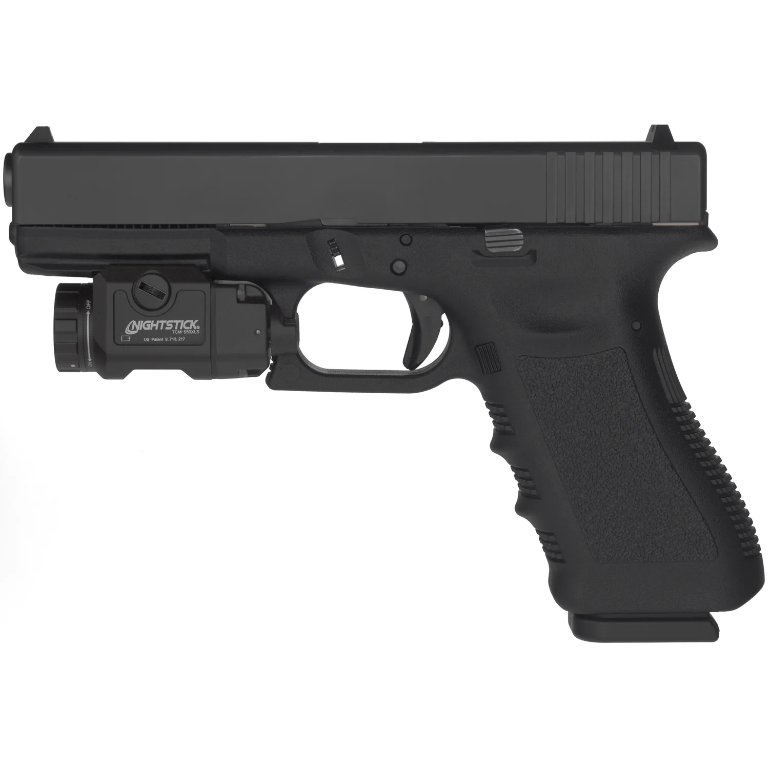 The TCM-550XL Compact Weapon-Mounted Light uses a super-bright LED rated at 550 lumens working in conjunction with a precision-engineered total internal reflection (TIR) lens to create a bright white beam of light rated at 136 meters. This weapon light features completely ambidextrous and intuitive rear-facing toggle switches on each side of the light to operate the momentary-on and constant-on lighting modes. The housing of the TCM-550XL is constructed from aircraft-grade 6061-T6 Aluminum with a polymer rear housing. Includes four handgun-specific modular rail inserts (pre-configured with C1 insert for Glock pistols), two spare Allen screws, an Allen wrench, and one CR123 Lithium battery.