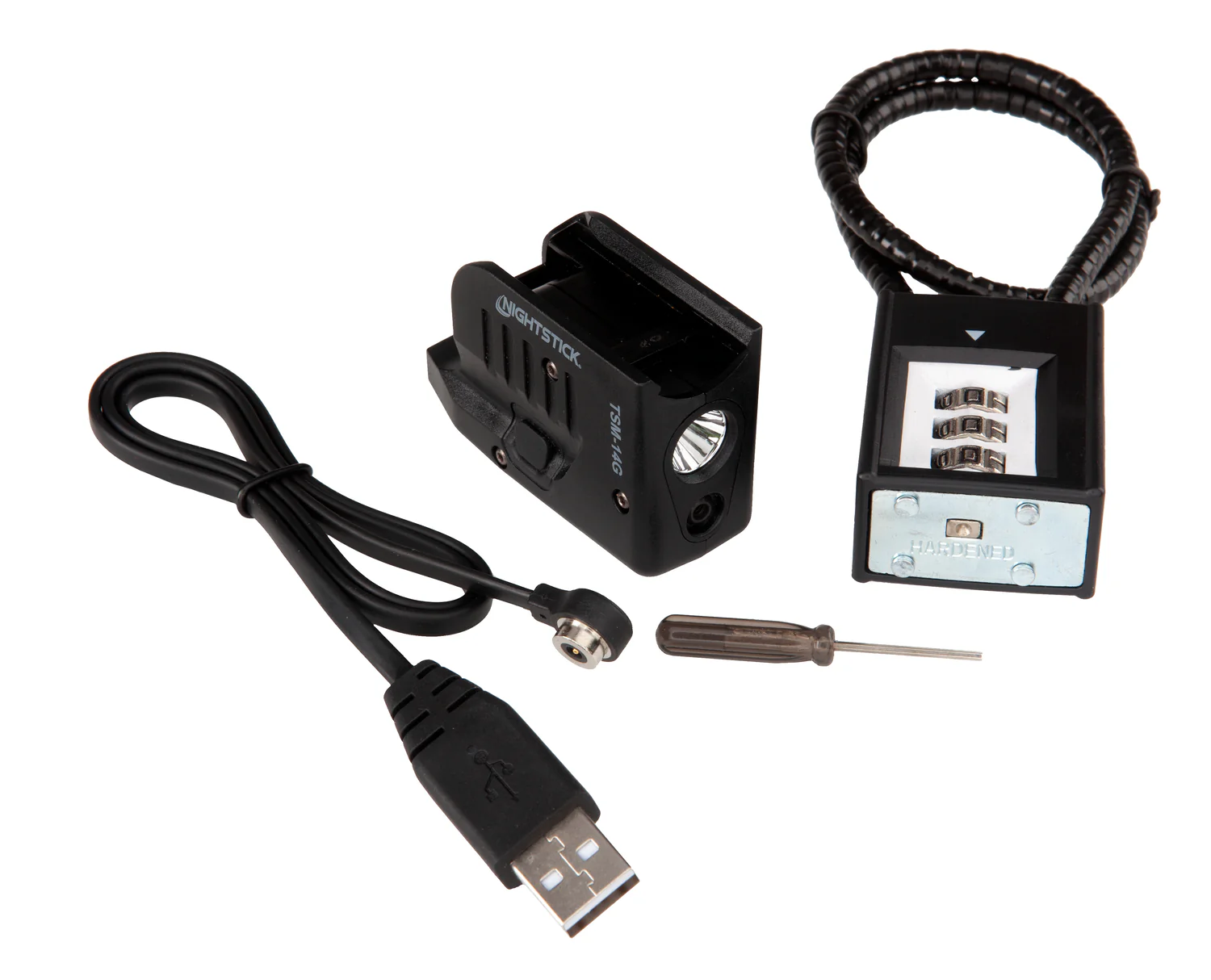 The two glass-filled nylon plastic housings of the TSM-14G is designed to lock onto the front of the pistol’s trigger guard for secure installation and the lowest profile possible. The weapon light includes a Nightstick MagMate™ USB magnetically coupled charger, a combination gun lock for secure charging, and an Allen screwdriver for installation and laser aim adjustments.