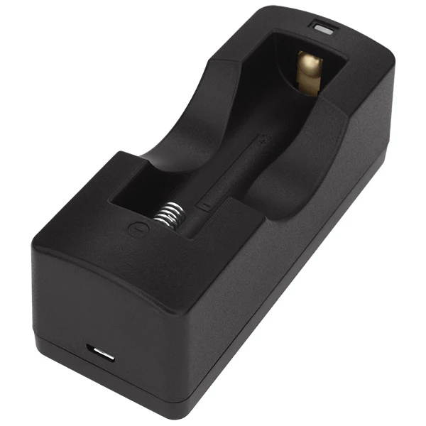 This portable micro-USB external battery charger is designed to recharge single-cell non-proprietary 14500, 16340, 18650, or 26650 lithium-ion rechargeable batteries. Embedded is a red/green LED voltage indicator light that illuminates red when charging and green when fully charged. Not designed to be operated in a hazardous environment. Micro USB cord not included.