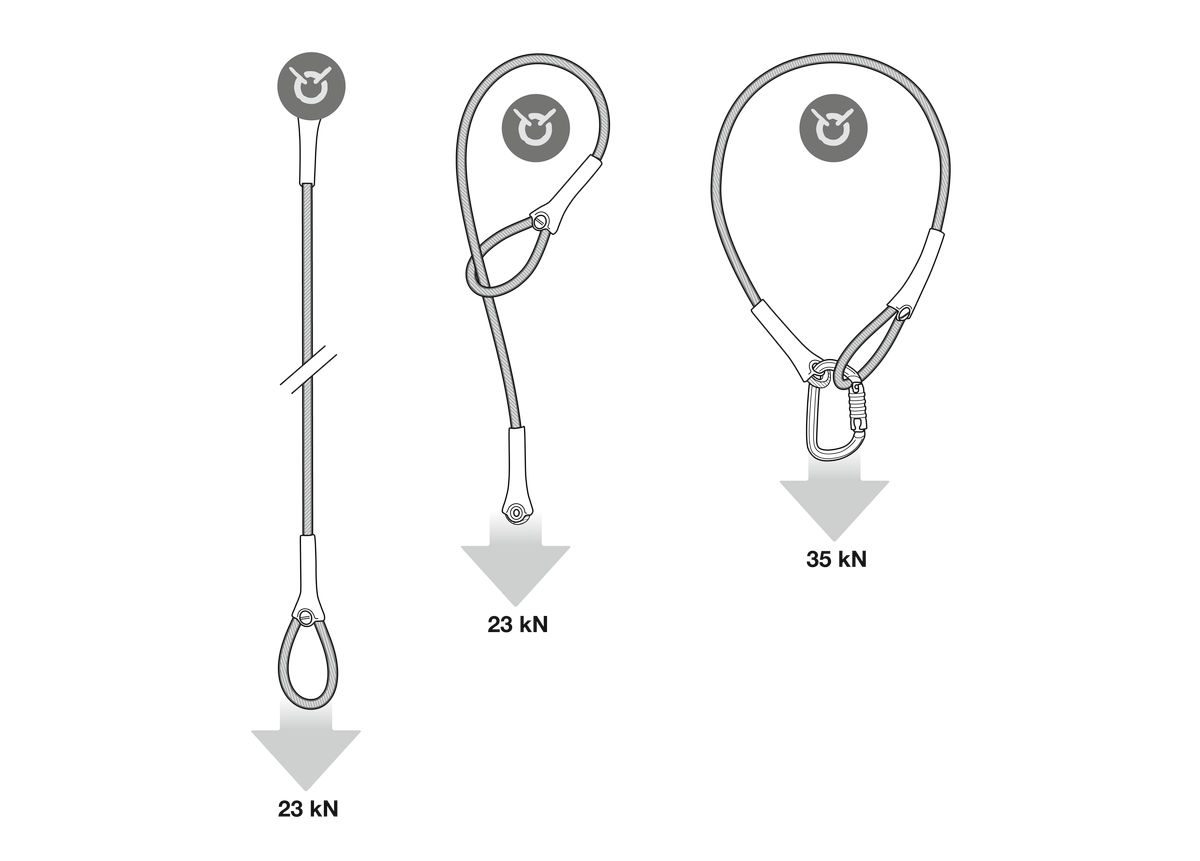 WIRE STROP is an anchor strap made of 6.5 mm diameter galvanized steel with two terminations of different sizes. It offers several configurations for setting up an anchor: directly to an anchor point or around a suitable structure. The plastic sleeve helps keep the connector in position and facilitates clipping. It is available in five lengths (50, 100, 150, 200 and 300 cm).