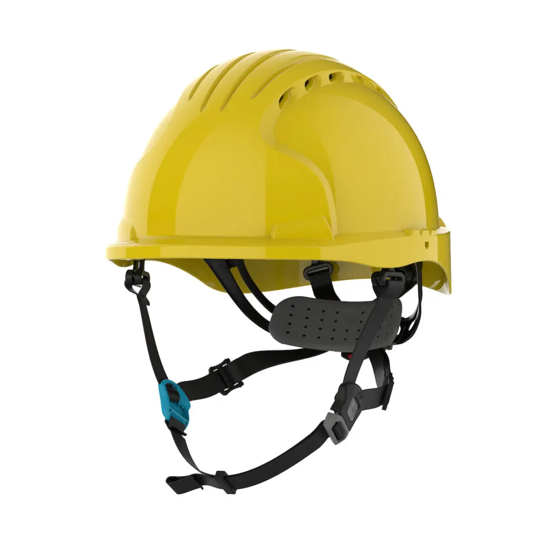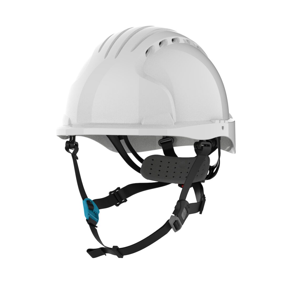 The EVO® 6200 Ascend™ Safety Helmets are the latest edition to the head protection line from JSP®. The EVO® 6252 Ascend™ includes an integrated 4-point adjustable chinstrap with quick release buckle and an EPS (Expanded Polystyrene) liner that absorbs vertical, frontal, lateral, and dorsal shock for hazards that may occur when working at heights.