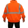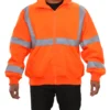 Our High Visibility Orange ANSI III Compliant Sweatshirt are 100% Safety Orange Fluorescent spun polyester microfiber fleece, weighing in at 10.5oz. The zip-hooded style has metal snaps so the hood can safely detach if snagged. It features a rugged YKK zipper, two pouch pockets for warming hands on chilly mornings, and 3MTM ScotchliteTM Reflective Material. You may to wear the sweatshirt alone or zip it into the lining of the 431 parka to form a waterproof systems jacket.
