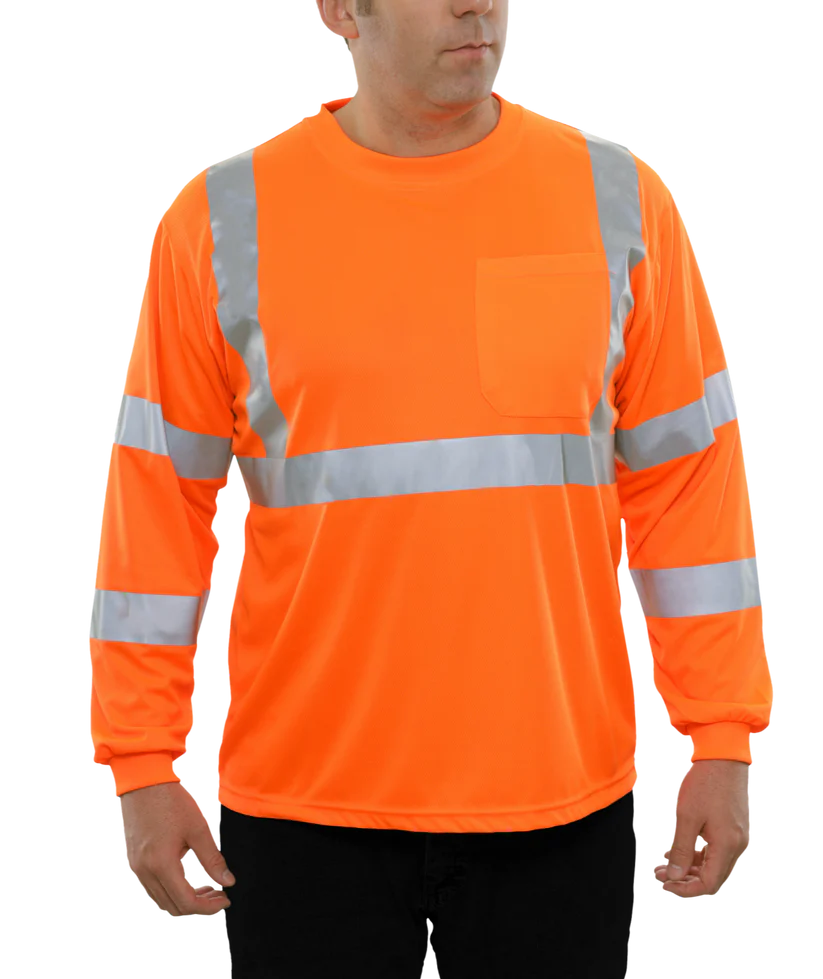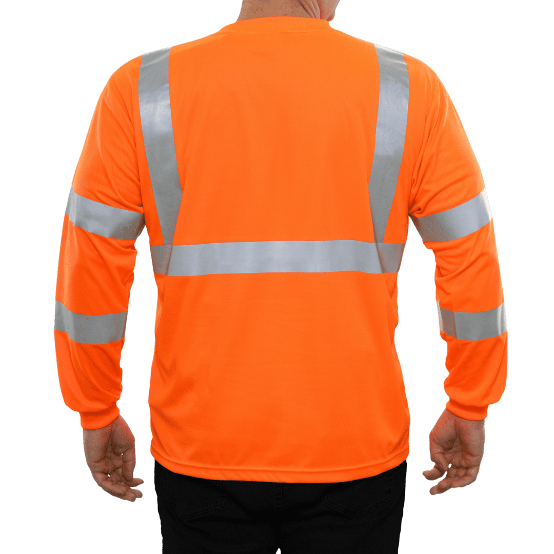 This Hi-Vis Orange Long Sleeve Safety Shirt is ANSI Class 3 Compliant. Made with lightweight 4.1 oz Birdseye Knit Fluorescent Orange Polyester. It feels butter soft on the inside, yet is work-wear durable. It is a great option when the weather turns cooler or when extra sun protection is desired. The safety orange performance fabric wicks away moisture 3 times faster than cotton. Our High Visibility Shirt is compliant to ANSI/ISEA Class 3 for increased conspicuity. In addition, this shirt features ANSI/ISEA 107-2020 Reflective Material durable through 50 washes.