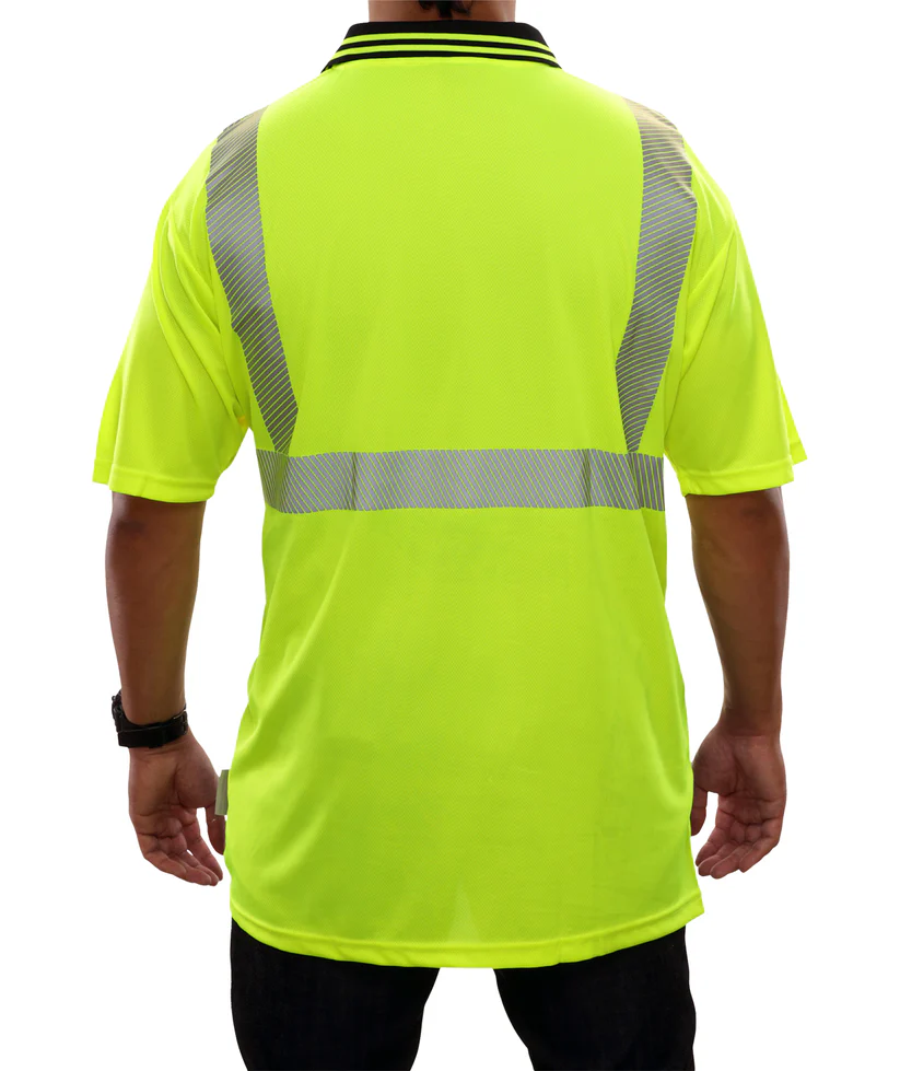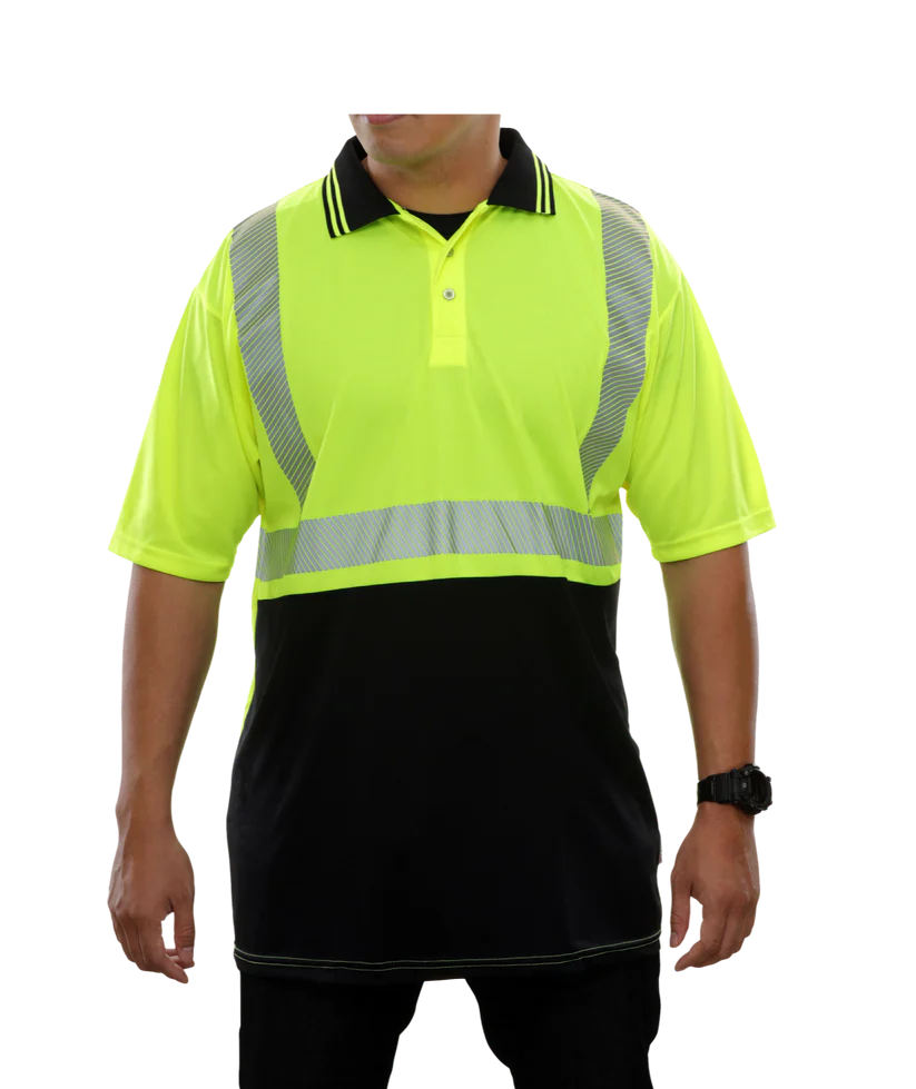 This Hi-Vis Safety Polo Shirt is ANSI Class 2 Compliant. Made with lightweight 4.1 oz Birdseye Knit Polyester. It feels butter soft on the inside, yet is work-wear durable. It features a rib knit collar and 3-buttoned placket for a professional appearance. Our High Visibility Shirt wicks away moisture 3 times faster than cotton and is available in two-tone lime/black to help hide stains and workwear. In addition, the 3M™ Scotchlite™ Reflective Material – 5510 Comfort Trim adds extra comfort and does not buckle or rub like sewn on reflective tape.
