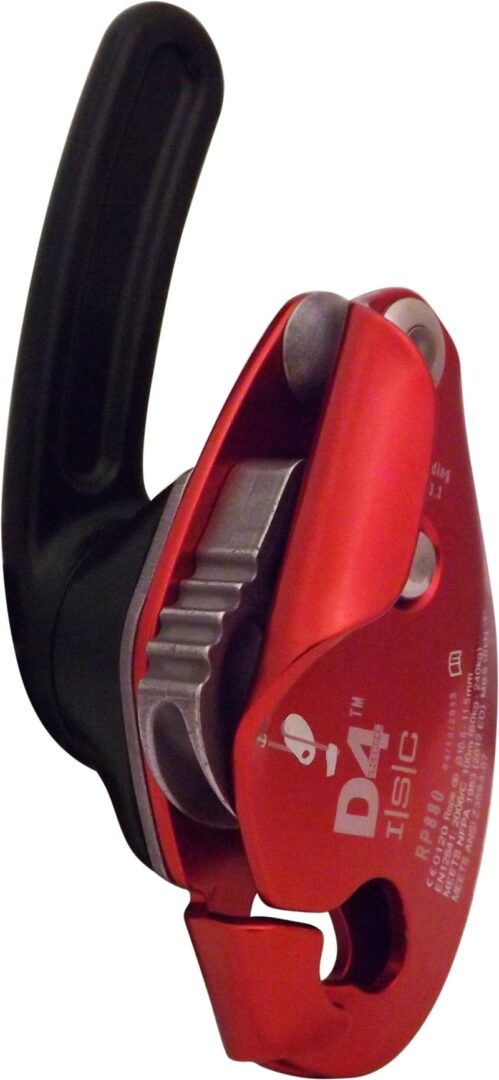 Special descender/belay device that easily controls 500 lbs loads. The side plate closes with a low-profile, spring-loaded safety catch. Simple, functional design. It can be placed onto the rope without removing the rigging carabiner. Rotate the handle counter-clockwise to lock it in place. Rotate right to descend or lower load. Rotating the handle too far clockwise will engage the panic stop function. Continued clockwise rotation re-sets the unit. The D4 is a true panic stop device rather than a panic brake device. The difference is that once the panic stop is activated, no other force must be applied to the device. A panic brake-style device requires a force input to continue the braking function. It can be used for progress capture in hauling systems and allows rapid conversion between raising and lower. For 3/8″ – 7/16 (10.5 – 11.5mm) ropes. See the D5 for use with 1/2″ ropes.