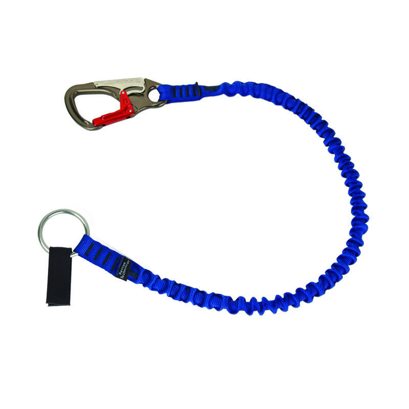 Constructed of Heavy Duty Tubular Webbing, elastic, and steel ring. One end has a 2″ ring to attach to the waist strap of Rescue PFDs. The other end is attached to our Forged Aluminum Autolocking Snap with an eye for extra security.