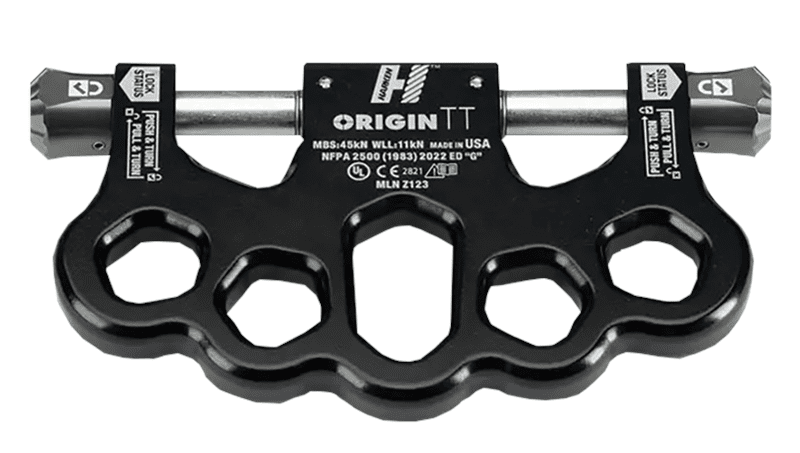 The Origin TT multi-purpose rigging plate improves the rigging and performance of Twin-Tensioned Rope Systems (TTRS). The Origin TT employs two quick-release locking pins. This enables independent attention to either of the twin devices managing ropes in the system while the other remains safely tensioned. The five attachment points on the anchor side enable rigging of SERENE systems (Systems Strong, Equalized, Redundant, Efficient with No Extension potential.)