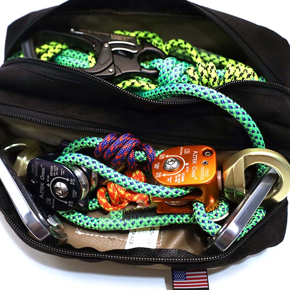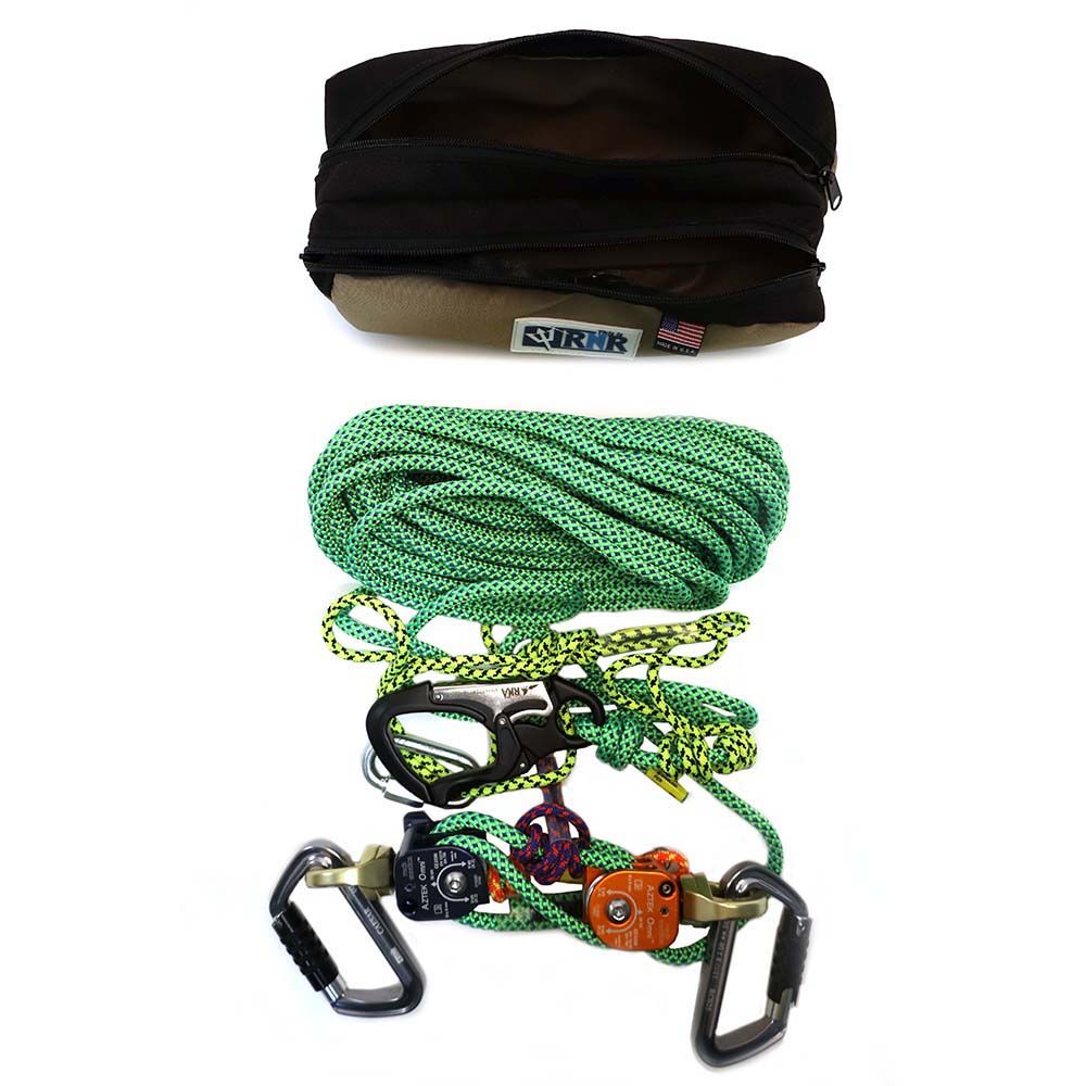 The AZTEK Elite mechanical advantage system is composed of two Rock Exotica high efficiency swivel block pulleys, a personal edge restraint, 50′ of purpose made RNR sewn cordage to create a versatile mechanical advantage system that can extend up to 12′ while providing a 4:1 or 5:1 ratio of mechanical advantage. Some uses which this system can be used for are: Pickoffs, tensioning hauling systems, mini-hauls, attendant mobility, high directional guying and much more! The system bag can be easily mounted to your belt, harness, stretcher, tripod, railing, etc. using the integrated belt loop and Velcro straps on the backside of the bag. The RNR Aztek Elite kit is undoubtedly one of the most versatile tools that can be added to your gear cache. The only limit is your imagination. Made in the U.S.A.