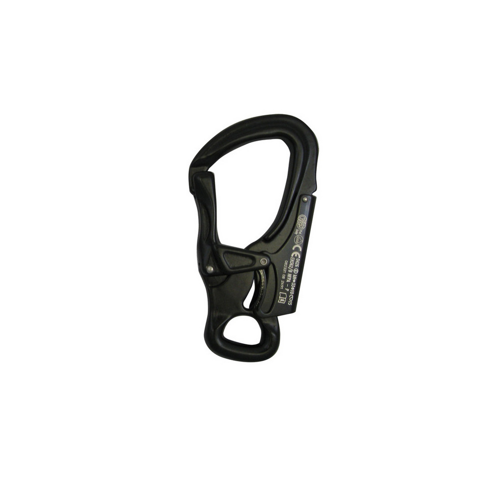 The forged aluminum, two-stage snaphook features a 2-step opening process that requires the user to squeeze the lever on the back before being able to engage the front gate.