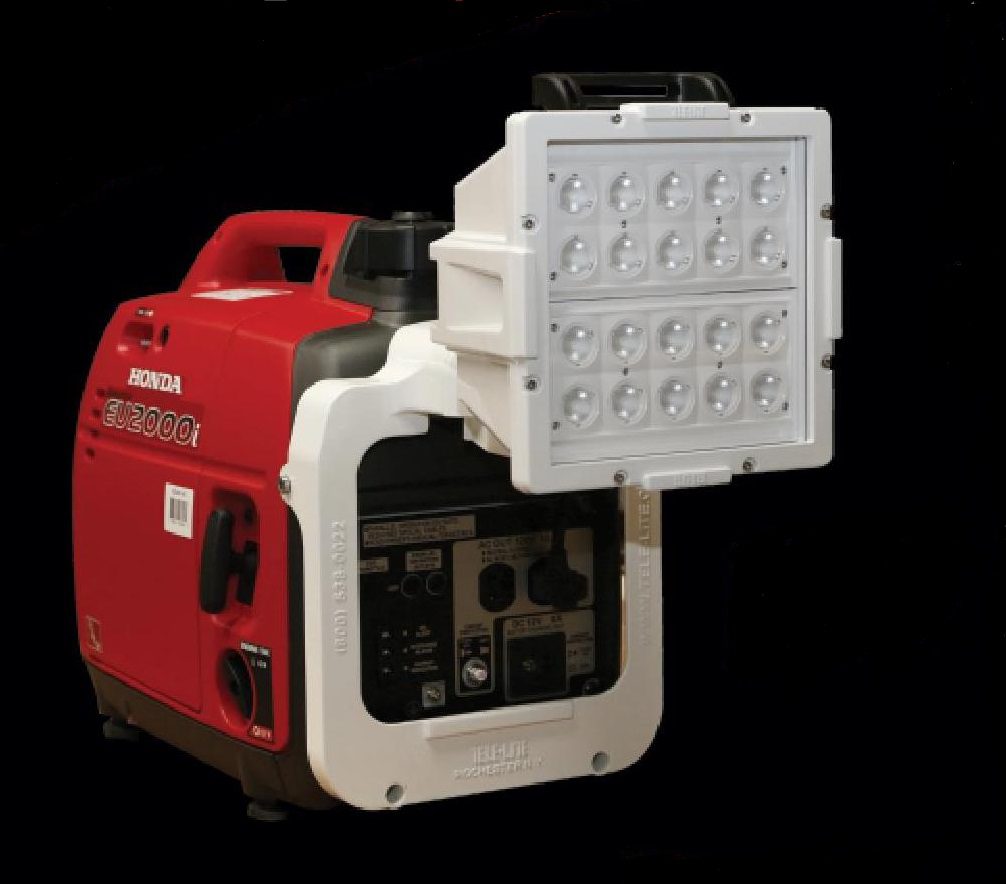 Designed and Manufactured exclusively by TELE-LITE, our TEU-22.LEDTL6 LED light/generator provides 15000 Lumens of LED lighting. These generator/lighting units are powered by the Honda EU2200i 2200-watt inverter-style generator and are quiet, light-weight and fold for compact storage.