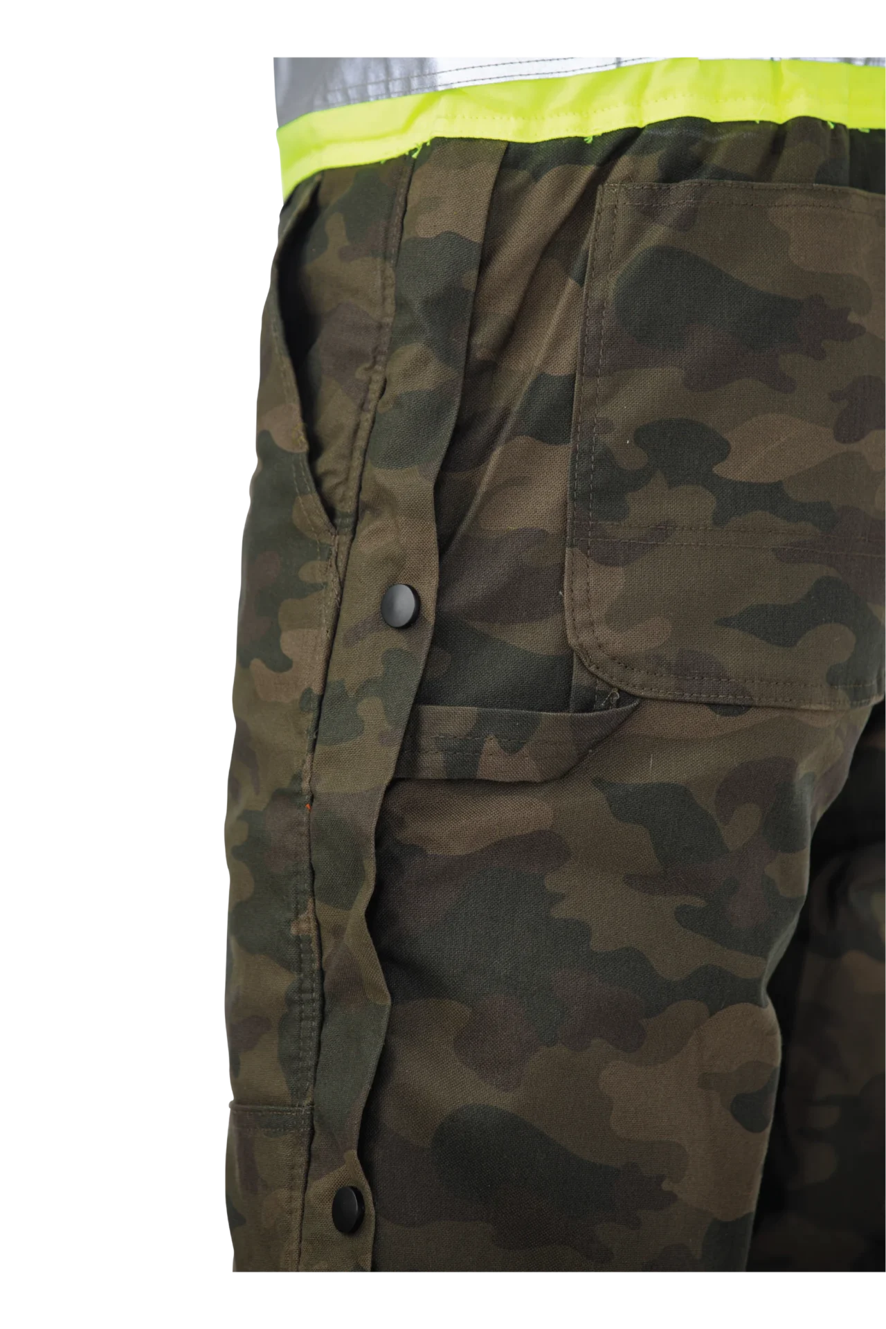 Introducing our innovative bib from the enhanced-vis camo program—a new approach to safety gear that’s both water-repellent and flexible. Crafted from 98% cotton and 2% spandex flex duck with a durable water-repellent finish, this bib features polyester insulation for warmth. It includes 3Mâ„¢ Scotchliteâ„¢ reflective material for visibility, a heavy-duty, 2-way zip front closure, storm facing with snap closure, adjustable shoulder straps, and ankle-to-hip side leg zippers with snap storm flap closure. Functional pockets like upper and lower patch pockets, rear patch pockets, a hammer loop, and ruler pockets provide convenience on the job.