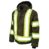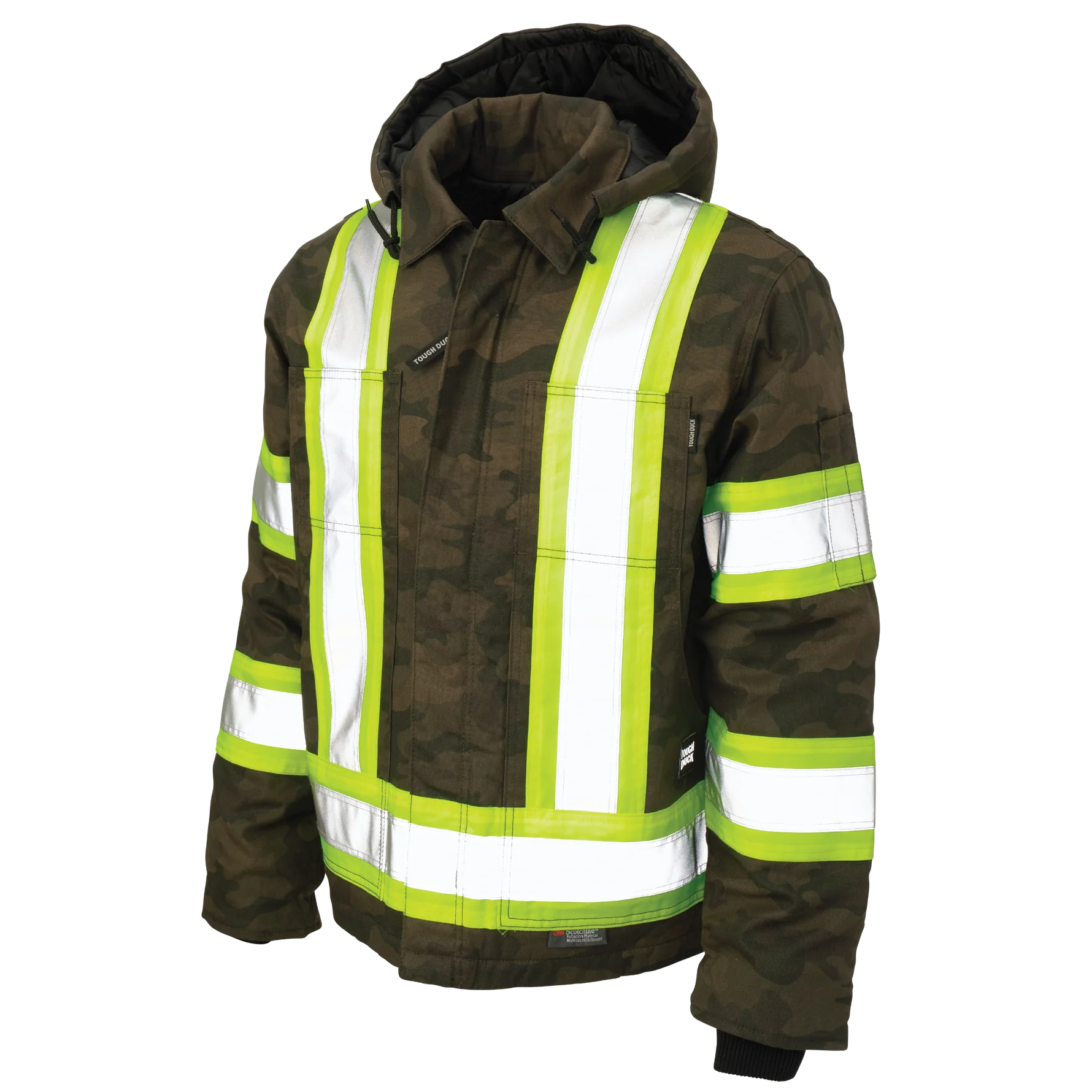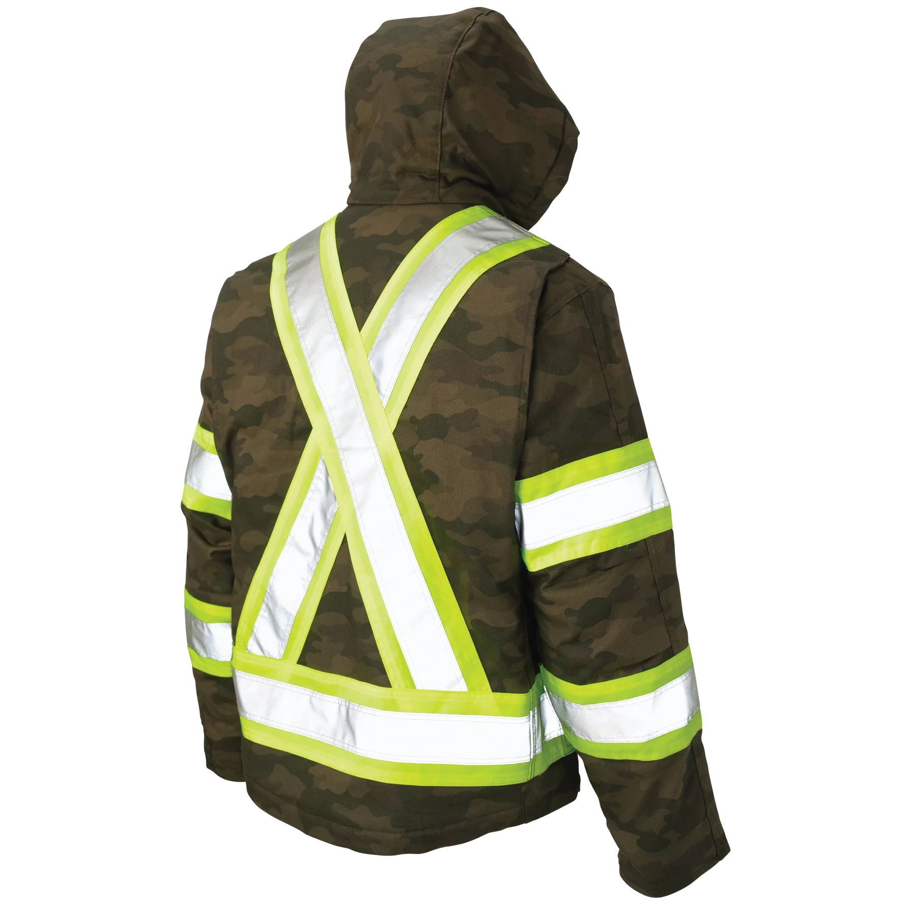 Make a bold statement with our durable and warm enhanced visibility camo jacket, designed for drivers and equipment operators who prefer a shorter length. Crafted from 98% cotton and 2% spandex flex duck with durable water-repellent finish, this jacket offers both toughness and comfort. Featuring 3M™ Scotchlite™ reflective material for enhanced visibility, along with a heavy-duty, full-zipper closure and storm flap for added protection. The quick-release hard hat hood and adjustable drawcord ensure versatility, while multiple pockets provide convenient storage