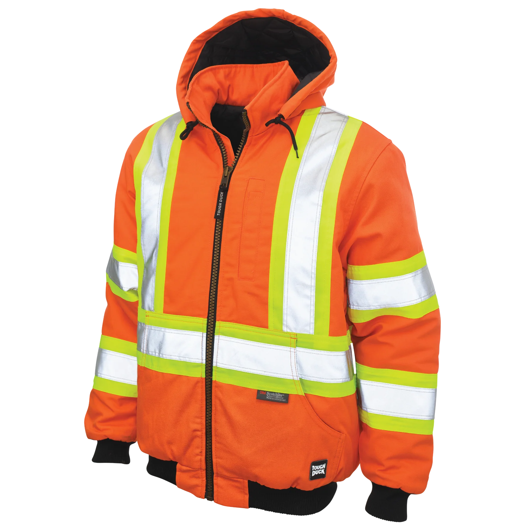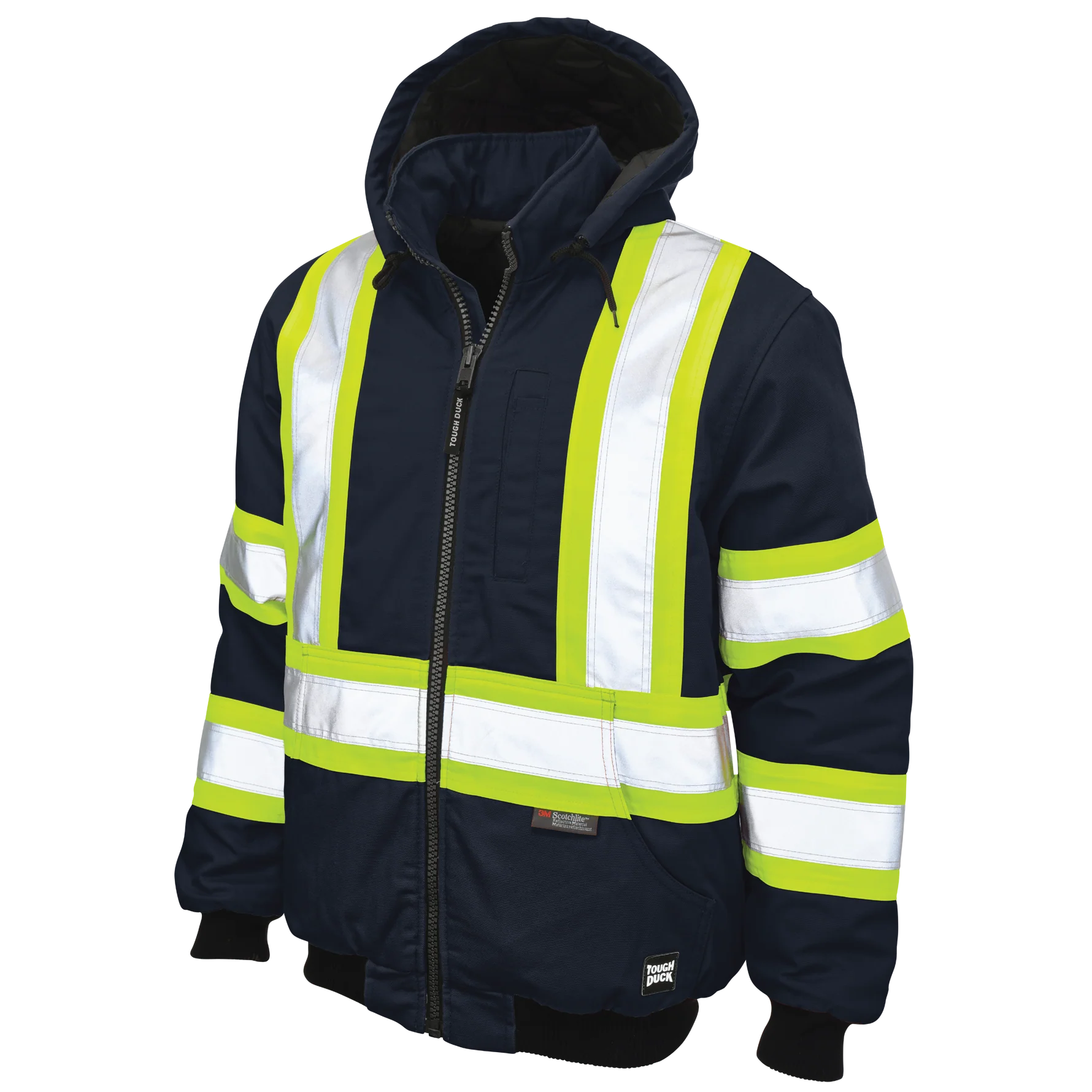 Stay protected and comfortable in any work environment with our versatile safety bomber jacket. Crafted from cotton duck with a durable water-repellent finish, this jacket provides warmth and durability. Its 3Mâ„¢ Scotchliteâ„¢ reflective material ensures visibility, while features like multiple pockets and a removable hood enhance functionality. Designed for comfort and freedom of movement, this insulated bomber jacket is perfect for all-day wear in various conditions.