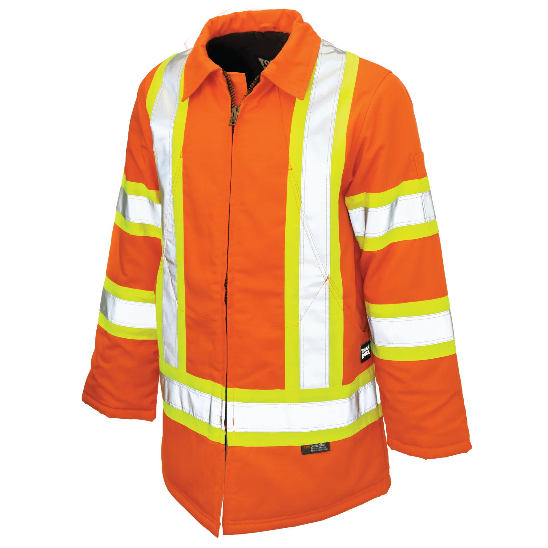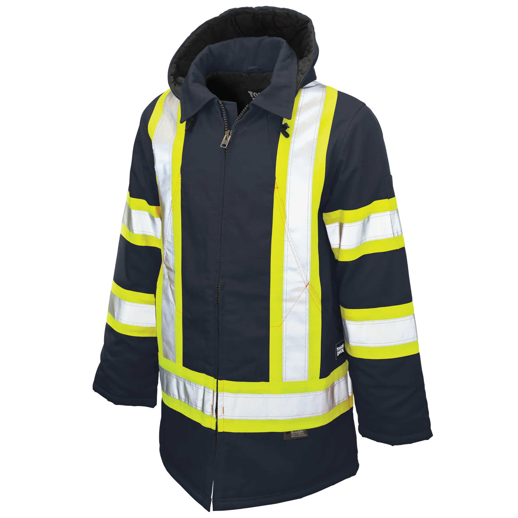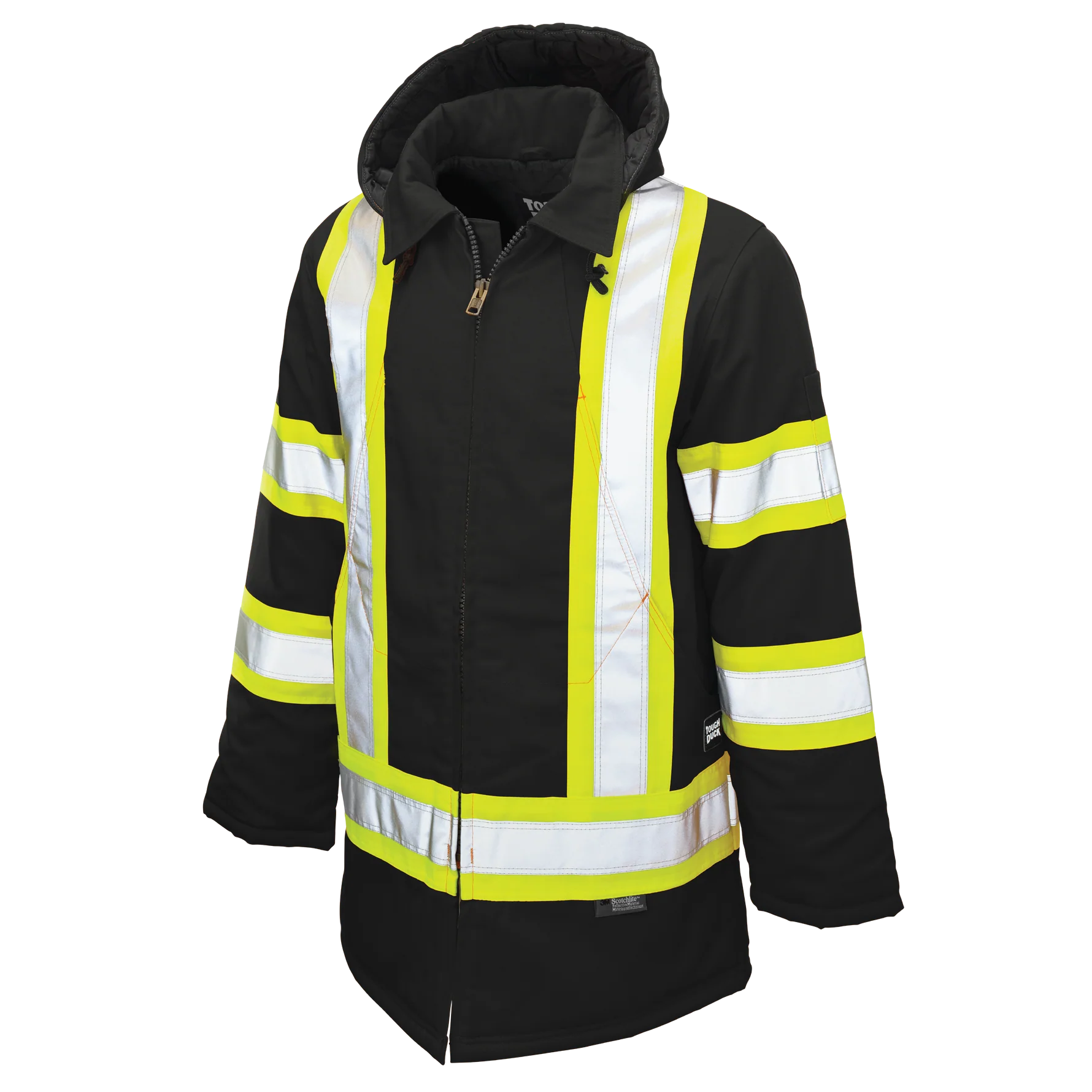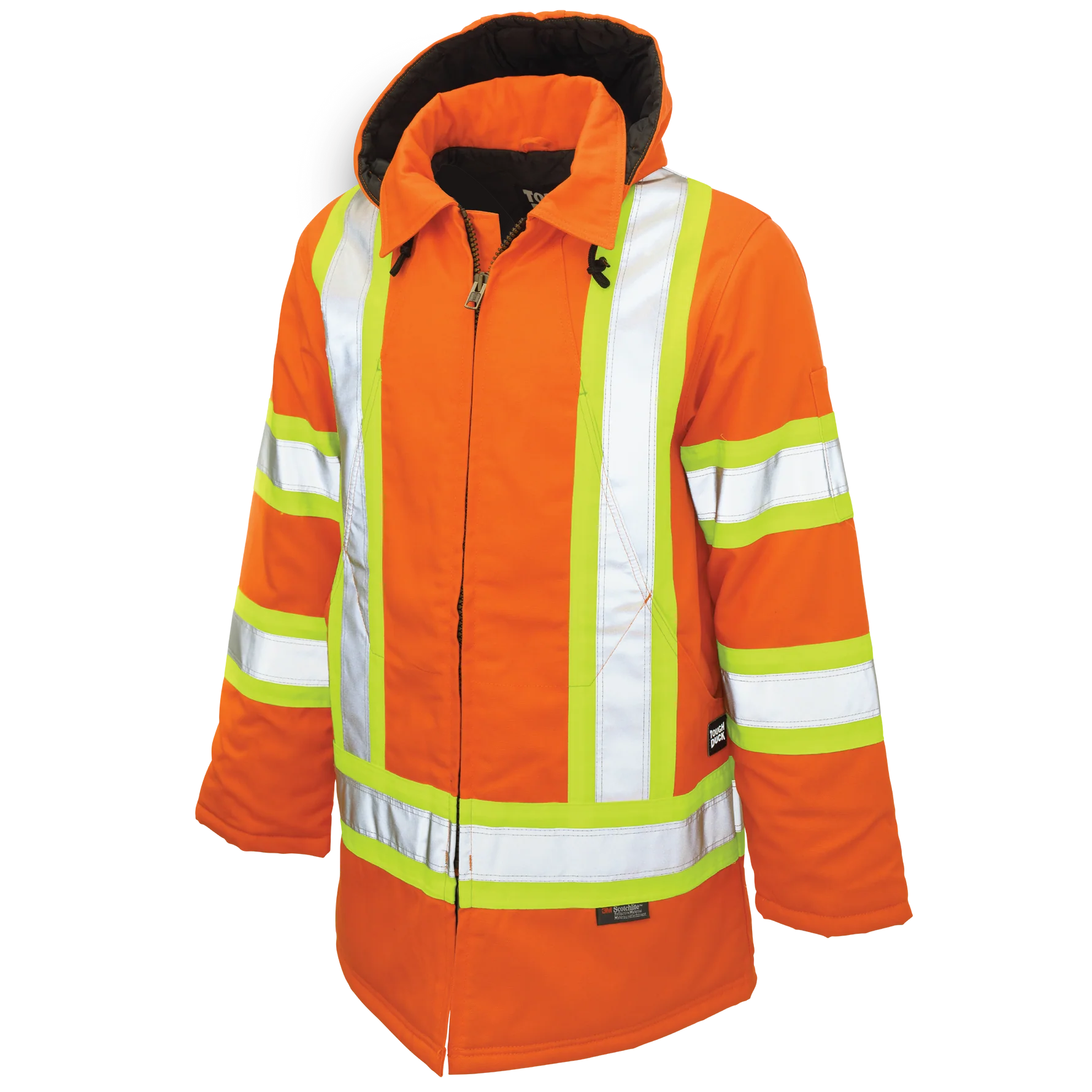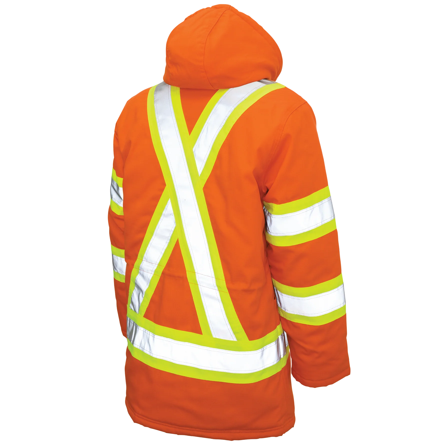Ideal for outdoor workers needing both warmth and visibility, this parka is a must-have for rugged environments. Built to withstand tough outdoor conditions. Crafted with a 100% cotton 10oz. duck shell and lined with 100% Polyester quilted to 6 oz. polyester insulation, this parka offers exceptional warmth and comfort. Featuring 3Mâ„¢ Scotchliteâ„¢ reflective material for high visibility, along with a quick-release hard hat hood, heavy-duty full zipper closure, and multiple pockets for convenience.