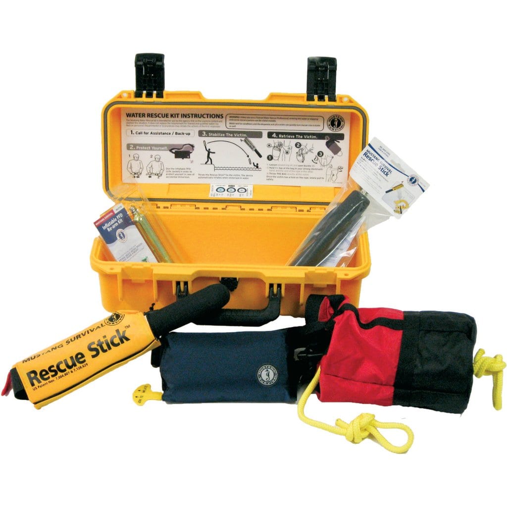 You’re first on the scene. There are victims in the water and time is running out… what can you do?;The first person on the scene is not always equipped to execute a safe water rescue. Without the proper equipment and training, the first responder may not be able to execute a safe rescue, greatly reducing the probability of the victim’s survival. In an emergency, seconds count. The Mustang Survival Water Rescue Kit contains everything the first responder needs to conduct a basic emergency water rescue: 1 M.I.T. 100 Inflatable PFD, 1 Rescue Stickâ„¢ and 1 Throw Bag all in a heavy-duty storage case. Complete with a quick reference instruction sheet and desiccant.