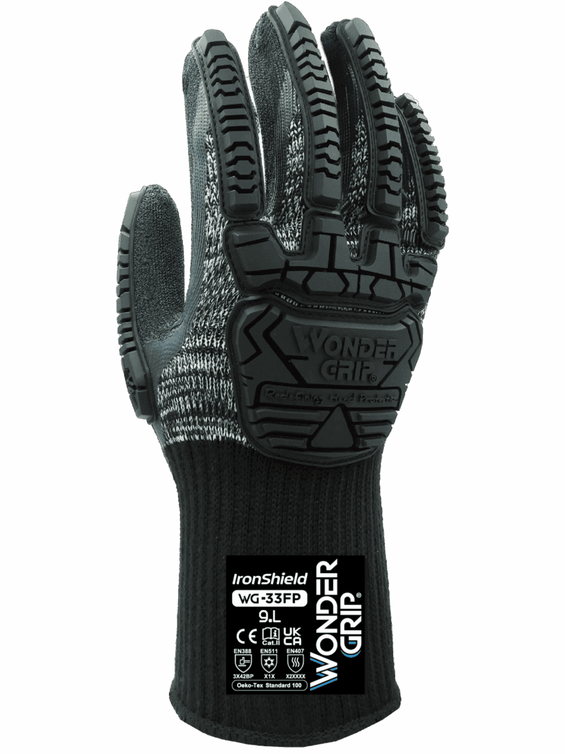 Wonder Grip® WG-33FP IronShield is specially designed for heavy work, offering its wearer an impressive set of protections: Heat, Cold, Cut and Impact.