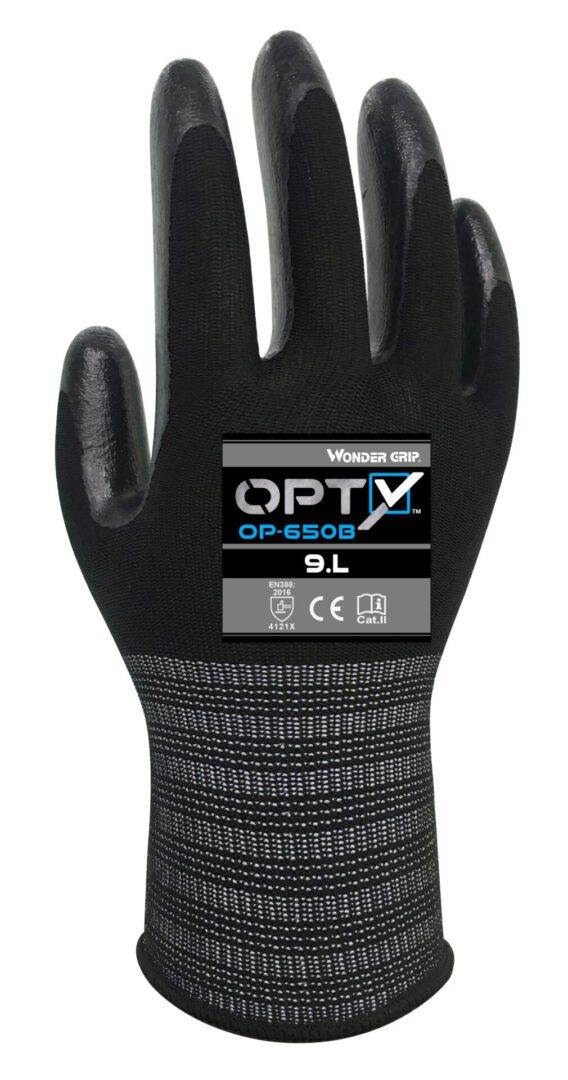 The Wonder Grip® OP-650B Opty™ is our ultra-lightweight palm-coated nitrile glove developed for assembling and handling work. OP-650B’s robust nitrile coating ensures total protection against liquids such as industrial oils while providing finger dexterity.