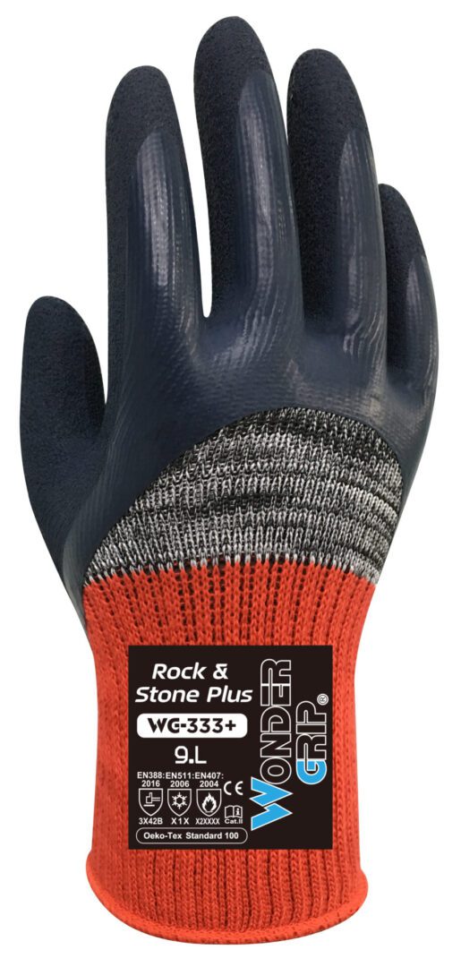 The Wonder Grip® WG-333+ Rock & Stone+ is a glove with a double latex coating constructed on a 10-gauge cotton and polyester liner. HDML™ coating specially developed by Wonder Grip® offers a non-slip surface for an outstanding grip. This unique product, specially designed for heavy work, combines: