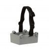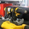 Solid, cast aluminum base with quick-release buckle strap. Secures most 20V drill guns.